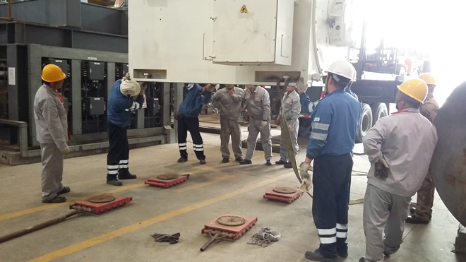 上圖為我北京吊裝搬運公司在室內通過人機精誠合作工作進行設備吊裝工作。