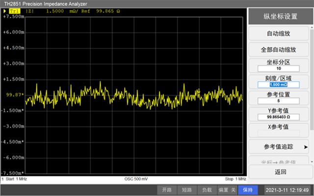 高精度、高穩(wěn)定性和高一致性:自動(dòng)平衡電橋技術(shù)的應(yīng)用,得以在10Hz-130MHz頻率、1mΩ-100MΩ的阻抗范圍內(nèi)都能達(dá)到理想的測(cè)量精度,其中最高精度達(dá)0.08%,遠(yuǎn)遠(yuǎn)高于射頻反射測(cè)量法的阻抗分析儀、網(wǎng)絡(luò)分析法的網(wǎng)絡(luò)分析儀的精度。圖2是在速度5、測(cè)試頻率1MHz,測(cè)量100Ω電阻的曲線,由下圖可見其軌跡噪聲≦0.003%(≦±0.0015Ω)。
