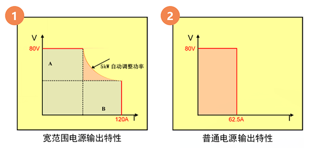 寬范圍電源較于普通電源具有更寬的輸出電壓、電流范圍,單型號電源可滿足客戶多規(guī)格產(chǎn)品的測試需求。電源的電壓與電流的輸出受極限功率的限制,減少輸出電流可獲得更高的電壓或者通過減少輸出電壓可以獲得更大的輸出電流,因此要比傳統(tǒng)的“矩陣”電源更加靈活。如圖所示: