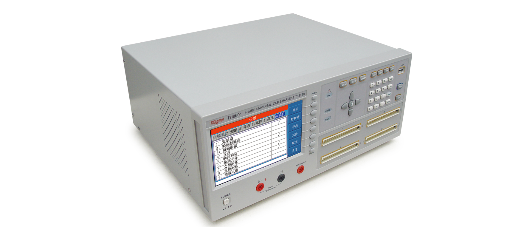 ■ TH8601系列四端線材綜合測(cè)試儀是專用于各種線纜,線束和排 線品質(zhì)及連接可靠性檢驗(yàn)的多功能,自動(dòng)化的線材綜合參數(shù)測(cè)試 系統(tǒng)。該系統(tǒng)提供可編程的恒流恒壓源以及高壓源,測(cè)試項(xiàng)目涵蓋了導(dǎo)通,被動(dòng)元件(電感,電阻,電容,二極管),交直流耐壓,絕緣電阻各種高低壓參數(shù)。本系統(tǒng)采用先進(jìn)的LCR數(shù)字采樣及高速長(zhǎng)壽命通道切換技術(shù),大大提高了測(cè)試精度,速度以及使用壽命。采用高低壓分離技術(shù),大大的提高絕緣電阻的測(cè)試性能。豐富的接口設(shè)計(jì),本儀器還提供RS232, RS485, GPIB, USB, Handler等接口,便于用戶運(yùn)用于自動(dòng)化檢測(cè)和自動(dòng)化產(chǎn)線。