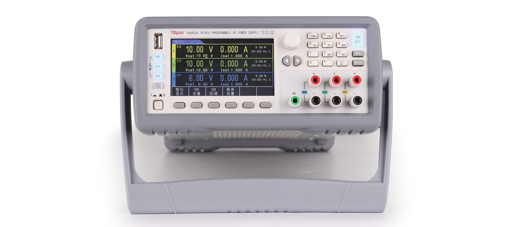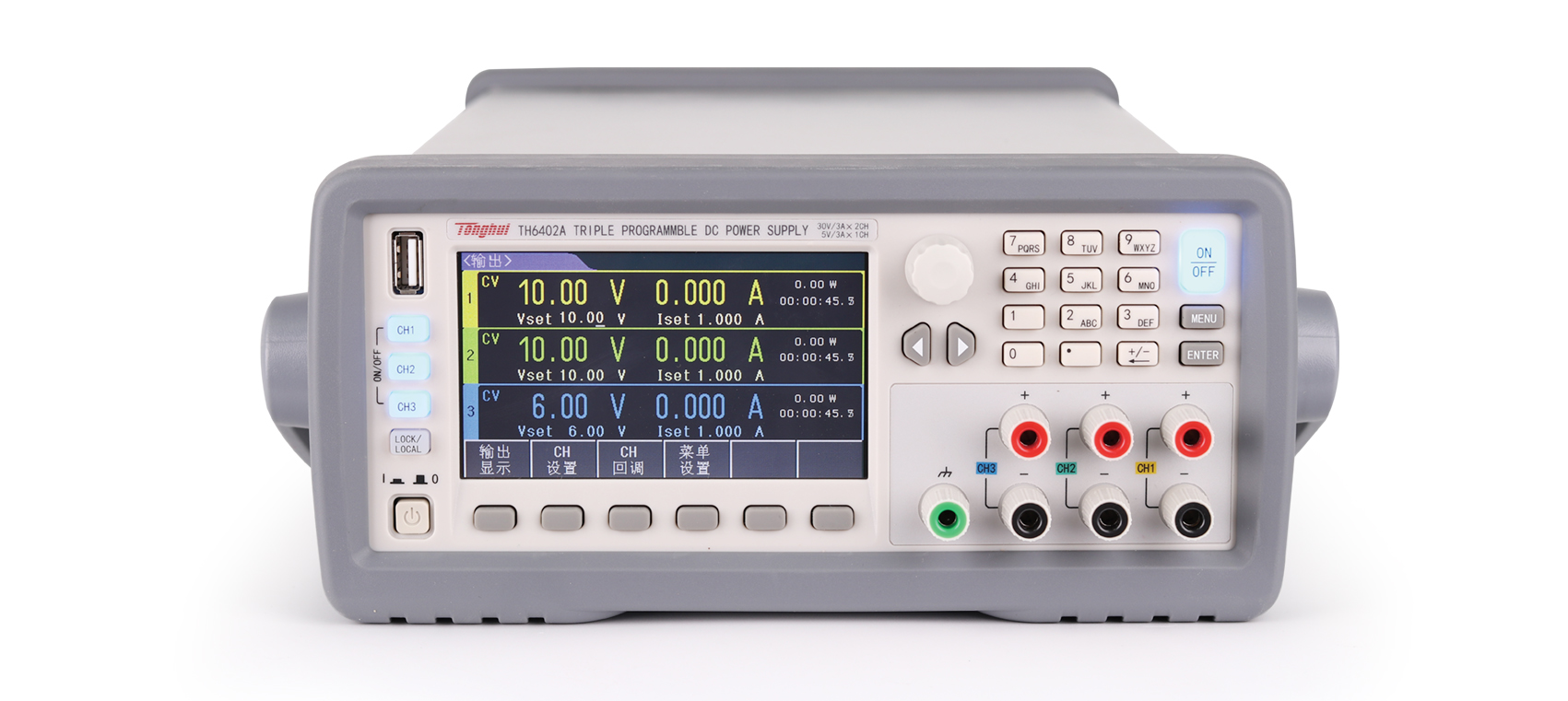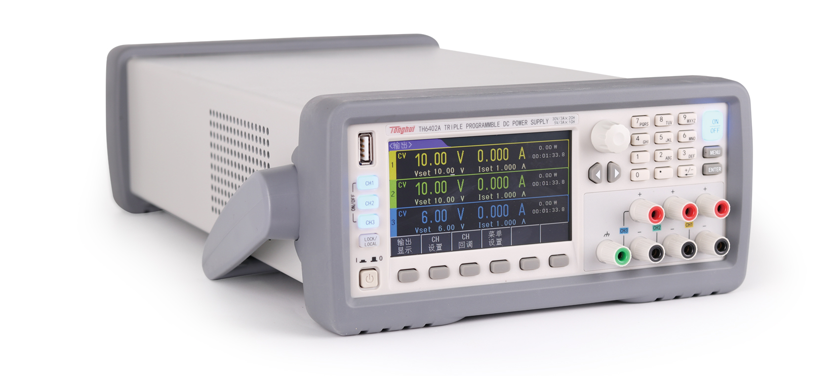 TH6400系列電源均為線性、程控輸出設計,因此該系列電源具有紋波小、噪聲低、精度高、穩(wěn)定性強的卓越性能。全系列采用4.3寸TFT LED顯示屏,不同通道分屏顯示,并以高對比度的顏色加以區(qū)分。UI設計方面儀器采用菜單化操作,軟鍵、旋鈕控制及輸入?yún)?shù),使用起來方便快捷,能很好的適應產(chǎn)線快速操作以及高校、實驗室的應用需求。