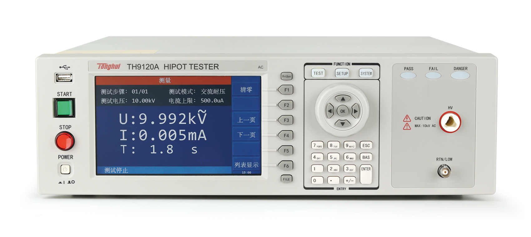 在耐壓測(cè)試方面,輸出功率 AC:200VA(10kV/20mA),DC:120VA(12kV/10mA),因此可用來(lái)為高耐壓的定子、電機(jī)等設(shè)備做耐壓測(cè)試,也可以對(duì)零件做同樣的測(cè)試。在絕緣電阻測(cè)試方面,所能顯示范圍為 0.1MΩ- 50GΩ,測(cè)試電壓為 50V-5000V 可任意設(shè)定。在開(kāi)短路檢測(cè)測(cè)試方面,可在進(jìn)行高壓測(cè)試前,先判斷被測(cè)件是否可靠連接,再進(jìn)行高壓測(cè)試。在顯示方面,所有的測(cè)試模式、時(shí)間、電壓、電流、電阻值、測(cè)試步驟等都在顯示器上顯示,另有列表顯示模式,顯示多步驟的設(shè)置及順序測(cè)試結(jié)果。